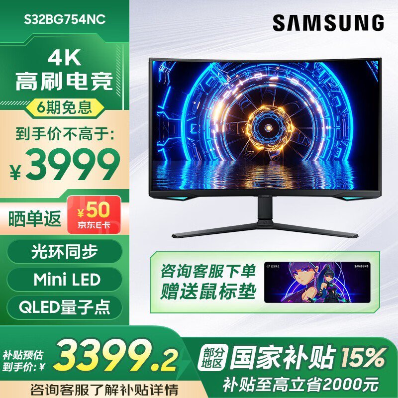 三星S32BG754N电竞显示器MiniLED面板4K分辨率特惠仅3399元