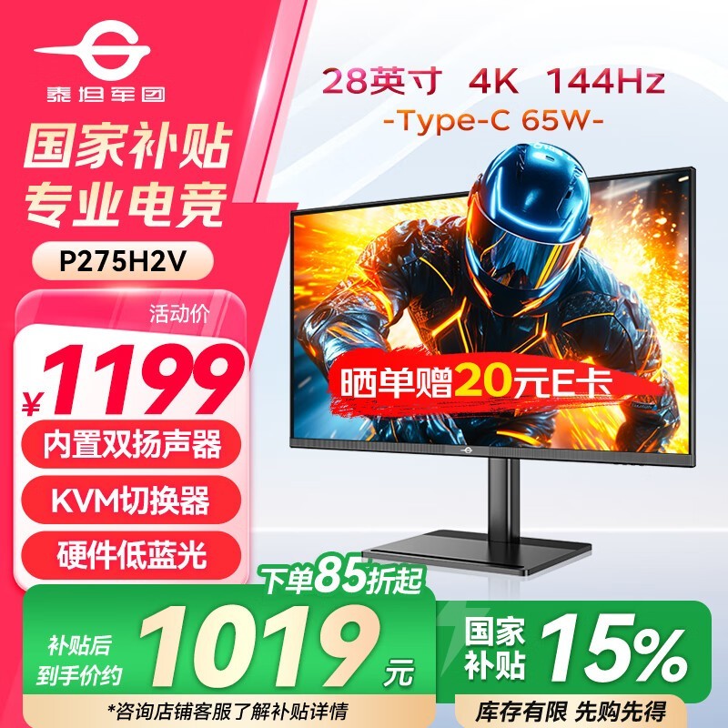 泰坦军团P275H2V显示器28英寸4K144Hz仅1019元