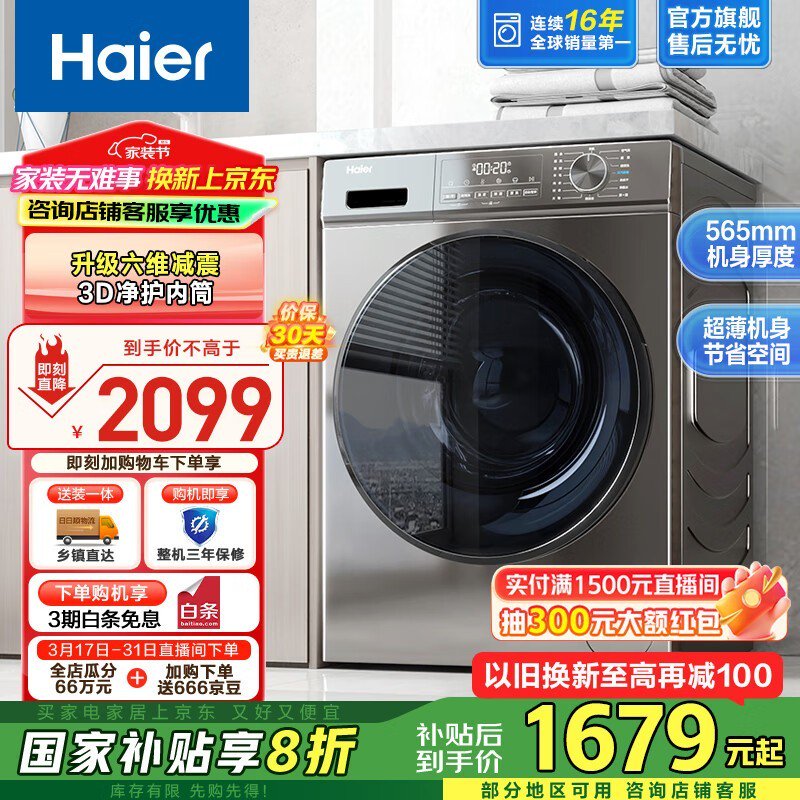 海尔10公斤洗烘一体洗衣机京东优惠价1454元