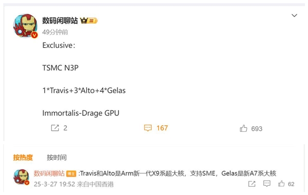 快科技3月27日消息,博主数码闲聊站暗示,联发科天玑9500基于台积电N3P工艺制程(台积电第三代3nm)打造,CPU由1*Travis+3*Alto+4*Gelas组成,同时集成了Immortalis-Drage GPU 。