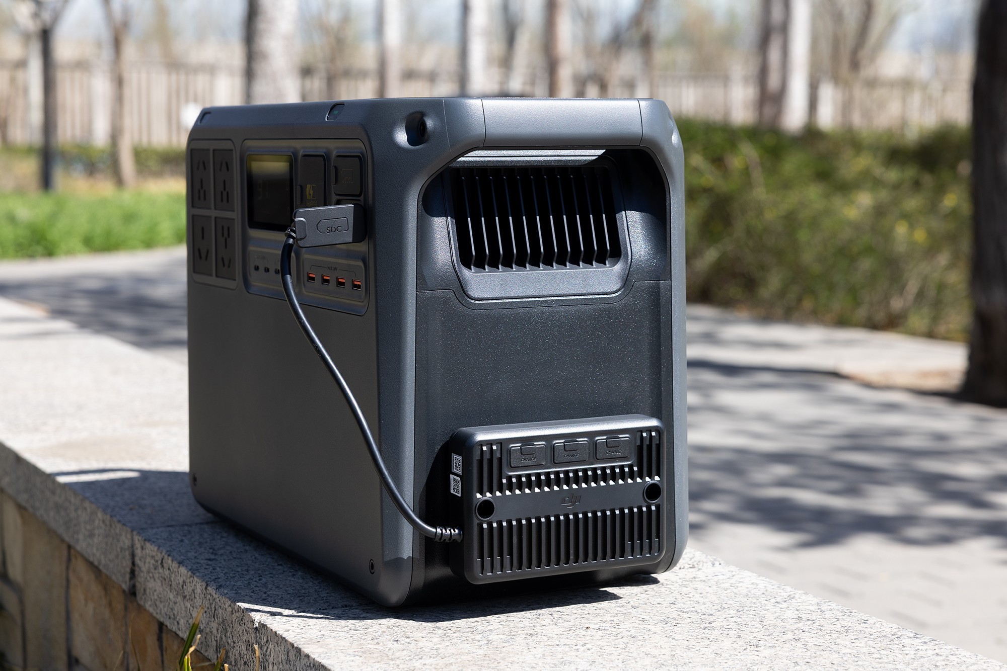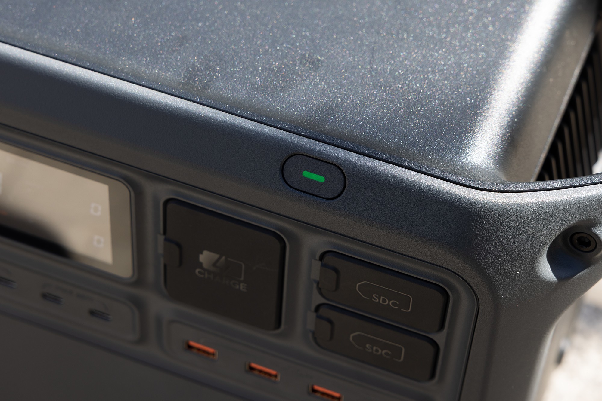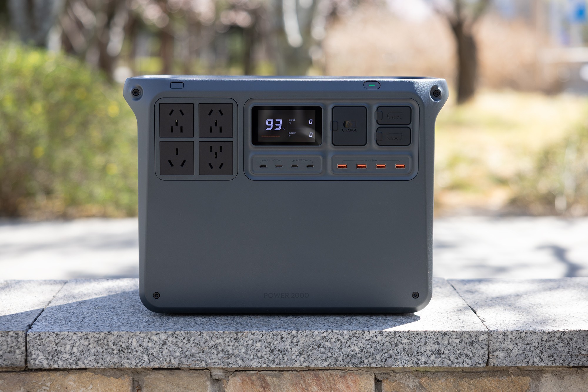 DJI Power 2000户外电源所有的接口、屏幕和按键都设计在了同一侧,使用起来非常便捷。DJI Power 2000的屏幕在中间位置,主要用于显示户外电源的电量、充电功率和放电功率。DJI Power 2000从左到右以包括了4个AC交流电插座、2个最高功率140W USB-C充电口,2个最高功率65W USB-C充电口,4个USB-A充电口,一个市电充电口,2个SDC接口。其中,两个SDC接口可以用于给大疆无人机电池进行快速充电,还可以外接太阳能板或者车载充电器为DJI Power 2000充电。产品的电源开关和AC交流电开关设计在单独区域,打开后会有绿色的指示灯提示。