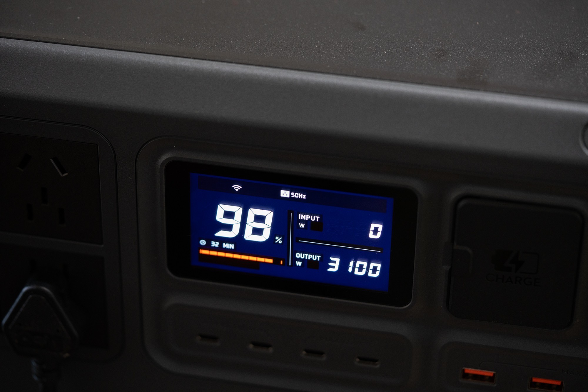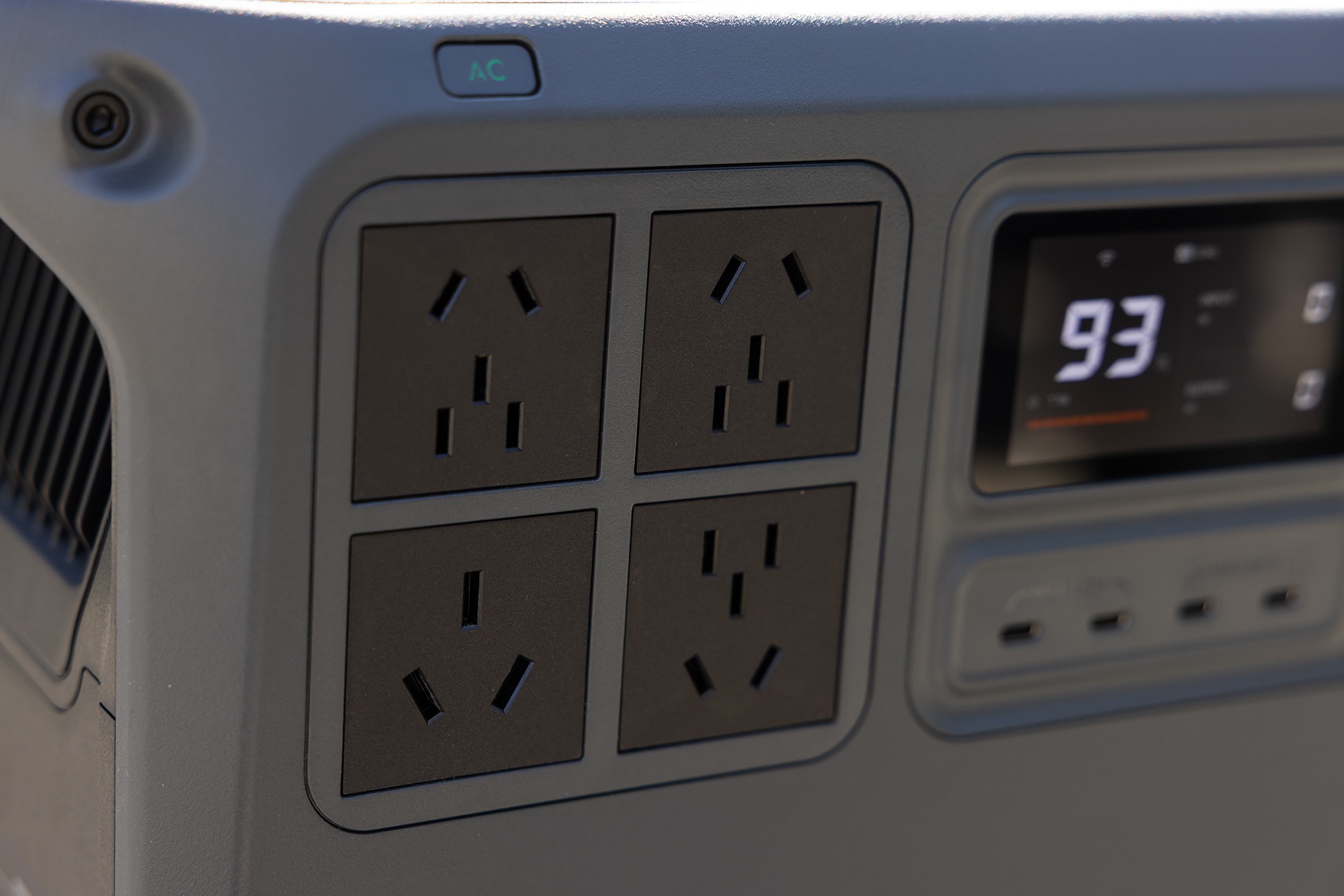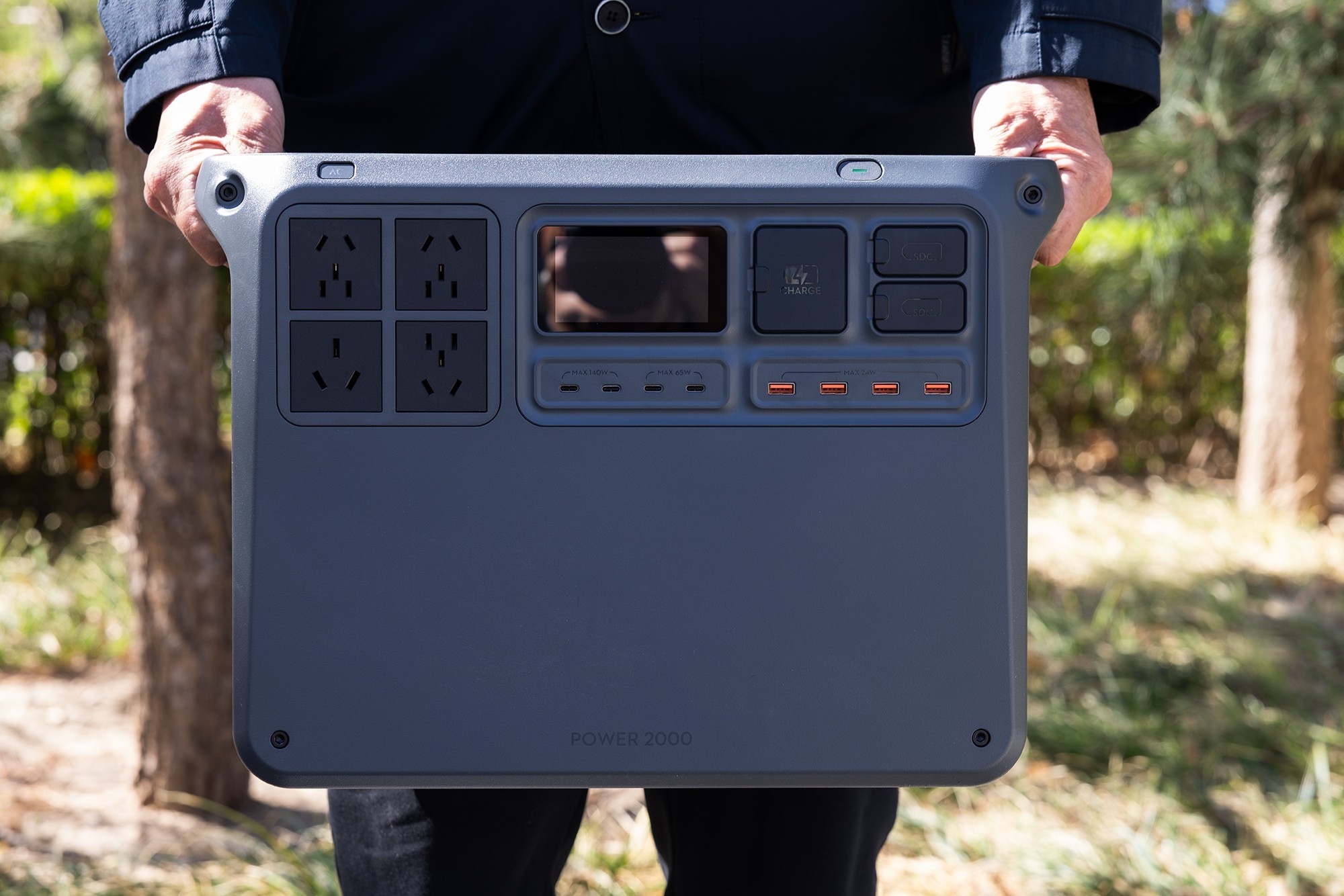 DJI Power 2000户外电源所有的接口、屏幕和按键都设计在了同一侧,使用起来非常便捷。DJI Power 2000的屏幕在中间位置,主要用于显示户外电源的电量、充电功率和放电功率。DJI Power 2000从左到右以包括了4个AC交流电插座、2个最高功率140W USB-C充电口,2个最高功率65W USB-C充电口,4个USB-A充电口,一个市电充电口,2个SDC接口。其中,两个SDC接口可以用于给大疆无人机电池进行快速充电,还可以外接太阳能板或者车载充电器为DJI Power 2000充电。产品的电源开关和AC交流电开关设计在单独区域,打开后会有绿色的指示灯提示。