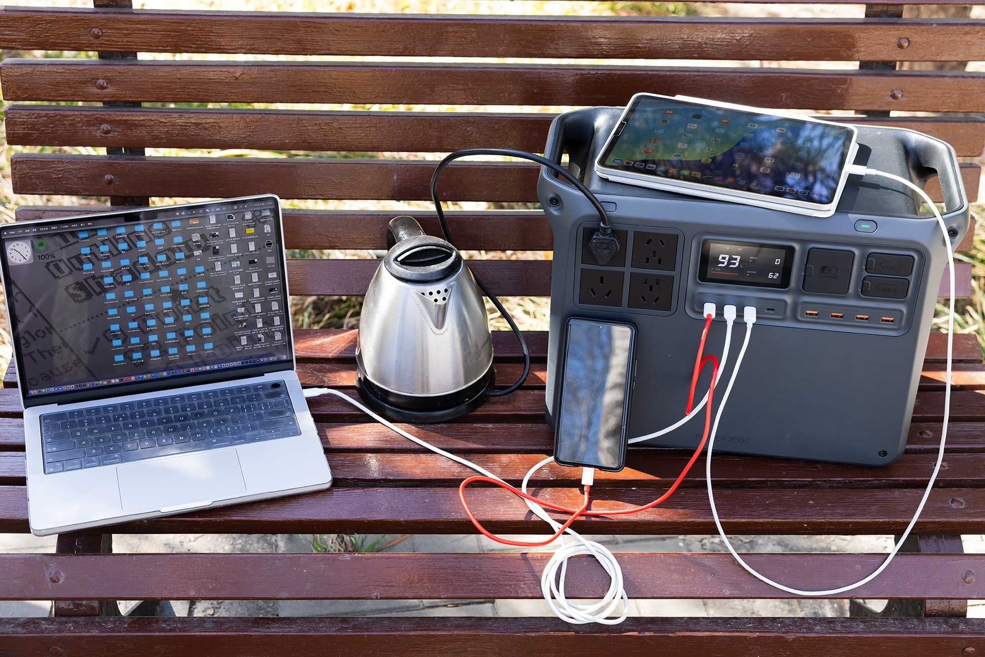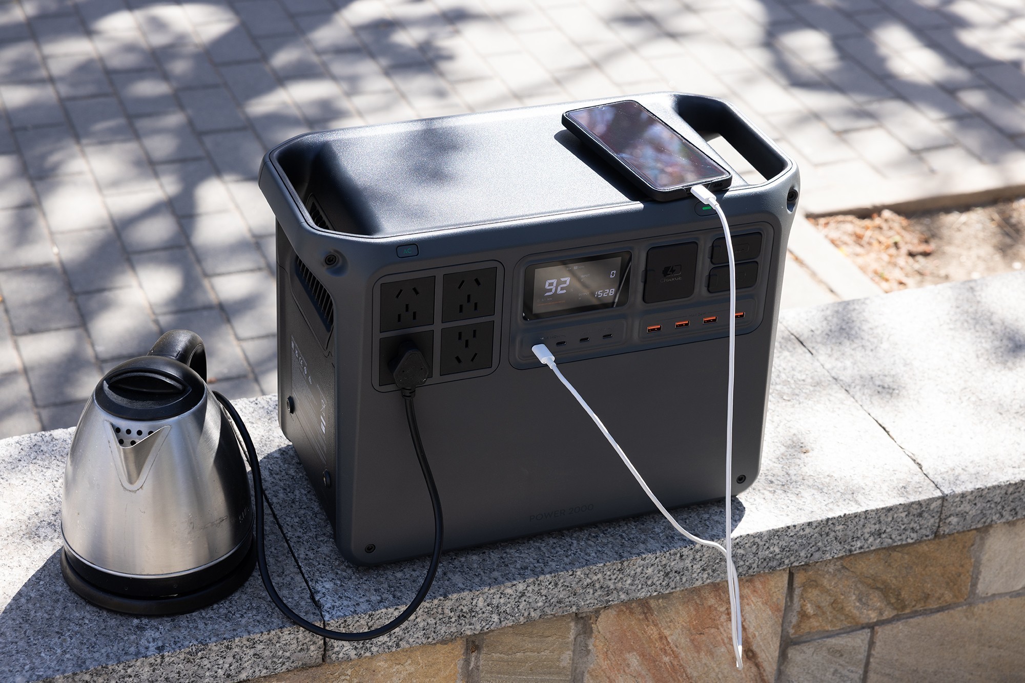 通过USB-C接和AC交流电插座给手机和热水壶供电