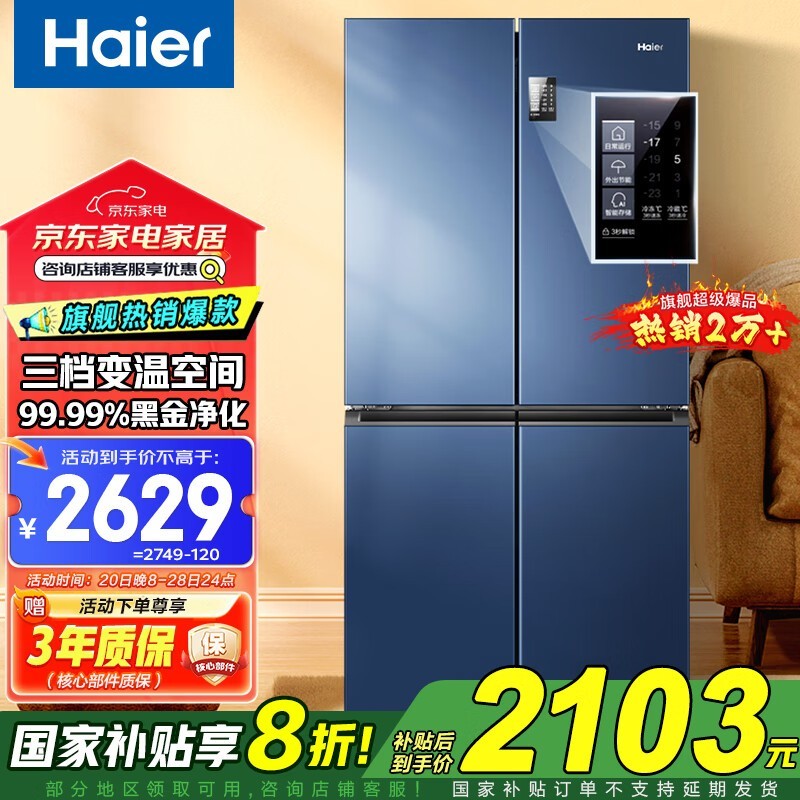 海尔467L风冷十字对开门冰箱BCD-467WGHTDEDB9首发特惠