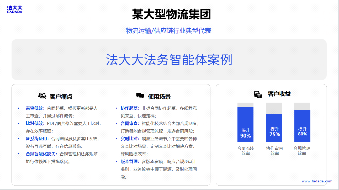 ● 人力成本降低:某集团法务部初级法务人力投入从10人/月减少至2人/月,人力成本降低80%。