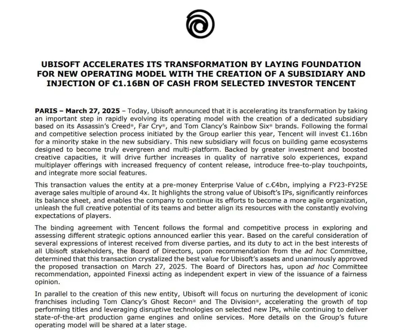 2025年3月27日,全球游戏行业迎来重磅消息:法国育碧(Ubisoft)宣布拆分旗下三大旗舰IP《刺客信条》《孤岛惊魂》《彩虹六号》及其开发团队,成立独立子公司并引入腾讯11.6亿欧元战略投资。交易完成后,腾讯将持有新子公司25%股权,而子公司投前估值达40亿欧元(约313亿元人民币),相当于育碧当前市值的2倍。受此消息刺激,育碧股价盘后涨幅近14%,资本市场初步对这场“IP资本化实验”投出了信任票。育碧久违的“大涨”此次交易的核心条款显示,腾讯注资将用于偿还育碧债务及新公司运营,但不涉足创意决策权——育碧保留IP所有权及100%控制权,仅向子公司授予“全球独家永久IP授权”以换取特许权使用费;腾讯获提名一名无表决权董事会观察员席位,并享有常规少数股东保护条款(如对重大资产处置的否决权)。育碧CEO Yves Guillemot称此举是“释放资产价值、加速敏捷转型”的关键一步,而腾讯总裁刘炽平则将目标锚定“打造长期常青游戏平台”。育碧公告原文至此,腾讯和育碧“亲密关系”再次升温了。两大头部厂商的深入合作最早可以追溯到七年前。2018年,腾讯以5%持股进入育碧股东名单,助其从维旺迪恶意收购中脱身;2022年增持至11%,成为第二大外部股东;本次交易后,腾讯则在育碧体系内形成“母公司股权+子公司权益”双重布局。产品协同层面,双方合作亦步步为营:2023年腾讯代理《全境封锁2》国服,通过社交裂变玩法提升DAU 37%;2024年联合开发《彩虹六号手游》,虽项目中途经历过数个月的“停摆”,但产品目前仍在推进。有分析师指出,腾讯对育碧的渗透遵循“先技术后IP”路径,此次拆分三大IP独立运营,实为规避欧盟反垄断风险的“曲线控制”策略。对腾讯而言,这场“豪赌”直指三大战略缺口:其一,填补主机/PC生态短板。天美、光子等工作室虽称霸移动端,但《刺客信条》系列(累计销量超2亿套)的3A基因恰是稀缺资源;其二,验证免费模式(F2P)嫁接可能性。新子公司有机会通过“引入免费入口、增强社交属性”,将育碧旗下游戏与腾讯《PUBG Mobile》《王者荣耀》等游戏的GaaS运营方法论相结合;其三,构建全球化IP矩阵。据预测,2026年服务型3A游戏收入占比将超45%,而《彩虹六号:围攻》(MAU 5800万)等成熟IP正是抢占赛道的利器。育碧的困局与破局同样值得深思。财务层面,其2024Q3净负债达12亿欧元,拆分资产可优化债务结构;组织层面,育碧公司超30%员工(魁北克、蒙特利尔、巴塞罗那三大王牌工作室为核心)集中于三大IP团队,独立运营有望提升人效;创新层面,保留《幽灵行动》《全境封锁》等IP后,育碧可专注AI生成内容等“颠覆性技术”研发。值得注意的是,育碧此前因《刺客信条:影》跳票及《星球大战:亡命之徒》销量低迷,股价一度暴跌61.68%,育碧小股东、私募基金AJ Investments甚至呼吁私有化并更换管理层。所以此番交易或为Guillemot家族抵御外部压力的关键防线。另外,这场交易或将引发三重链式反应:商业模式上,传统买断制加速向“本体付费+DLC+内购”混合模式迁徙;竞争格局上,索尼、微软或跟进投资中型厂商,EA已启动《战地》系列独立工作室评估;中国厂商出海路径上,“技术换IP”或成新范式,网易、米哈游等或加速绑定海外IP持有方。其中的潜在风险也不容忽视:腾讯此次“精准切割”式投资,本质是对3A游戏工业化能力的定向采购。若《刺客信条:影》能验证“单机叙事+服务型玩法”融合模型,或将催生3A游戏新物种。而对育碧而言,能否借腾讯之力打破“叫好不叫座”魔咒,将决定其下一个十年的生死棋局。当资本狂欢退潮后,真正考验双方的,仍是能否在“创意自由”与“商业变现”间找到动态平衡点——这场豪赌的终局,或许正伴随着2025年底的到来而悄然倒计时。