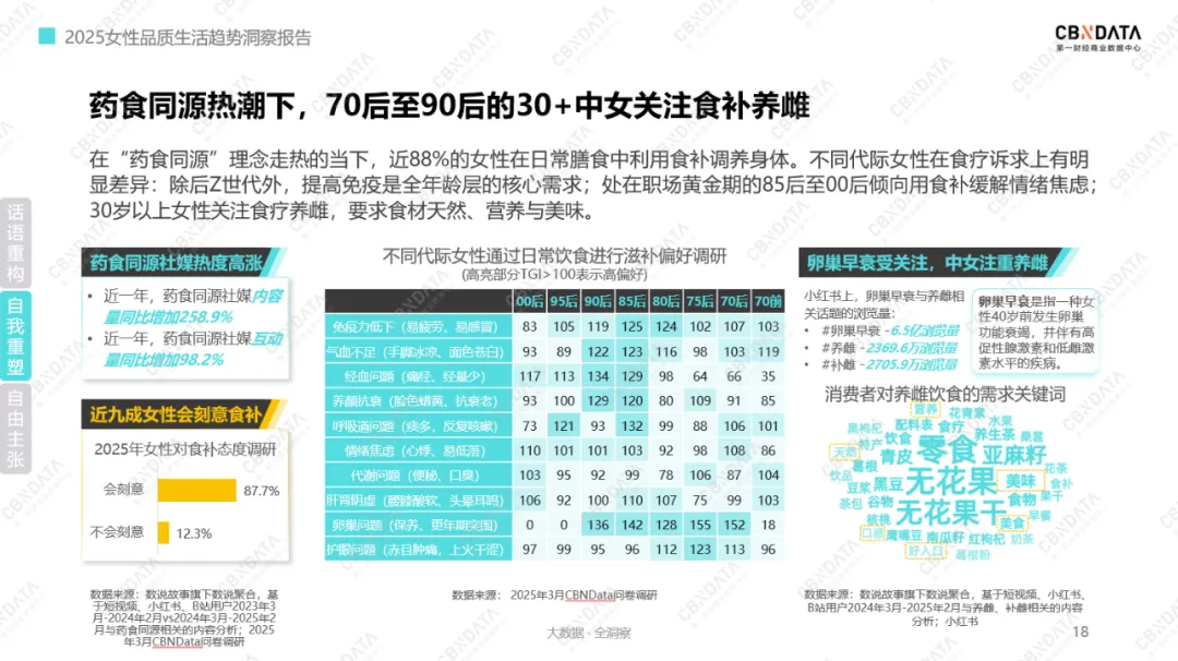 “内调”领域,随着药食同源理念走红,87.7%的女性投身食补养生浪潮。其中,70后至90后的30 +中女对“养雌”关注度拉满,围绕“营养美味”“天然”的需求关键词,将食补养雌的精细化追求展现得淋漓尽致,在一饮一食间书写自我滋养的生活美学。