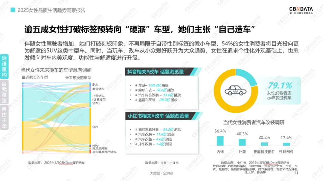 汽车领域同样彰显了女性消费力的革新。伴随女性驾驶者群体的壮大,“偏爱微小车型”的刻板印象已被打破。54%的女性消费者将目光转向更舒适的SUV等中型车,突破了自带性别标签车型的选择框架。而当玩车、改车从小众爱好走向大众潮流,女性对汽车的需求也延伸至个性化外观、车内美观度、功能性与舒适度升级。79.1%的女性有过爱车改装经历,生动诠释其在汽车消费中“自己造车”的自主意识,以及对多元用车体验的深度探索。