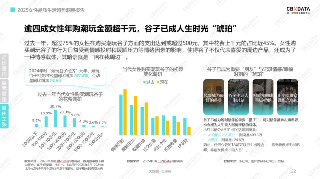 个性化消费从社会标价回归内心刻度,也反映在女性在潮玩谷子的消费上。过去一年,“潮玩谷子经济”强势崛起,《报告》调研数据指出,75%女性去年在潮玩谷子上支出超500元,近45%花费破千元。