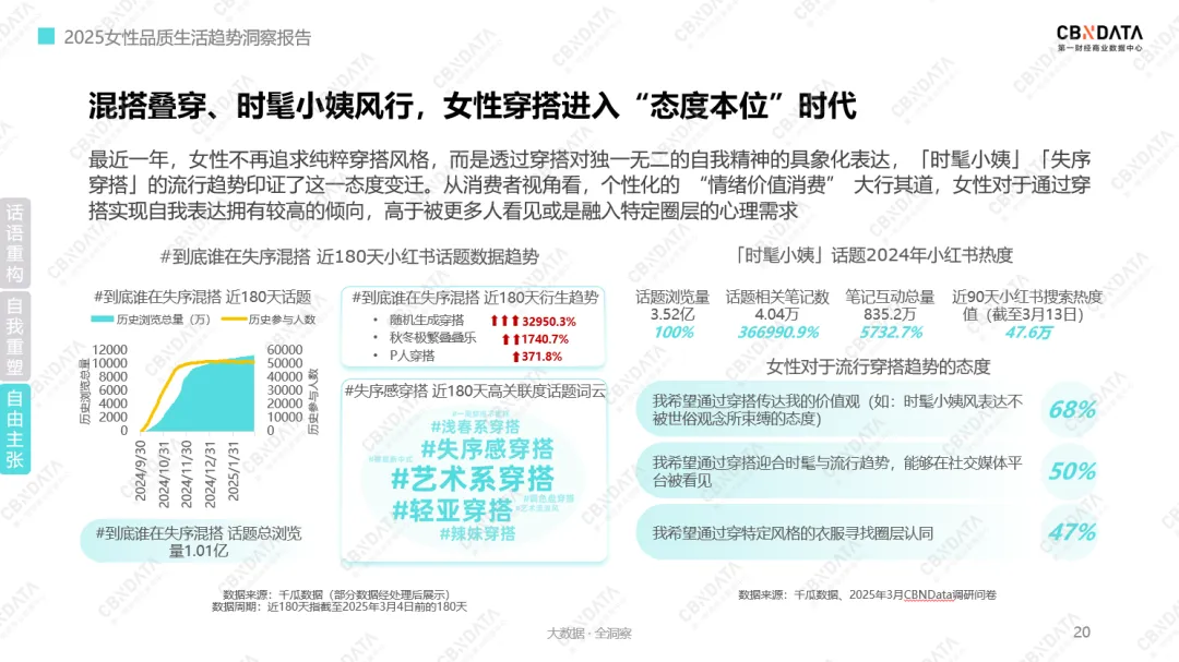 我们看到,在服饰鞋配的消费中,女性的购买决策从“彰显独特”转向“匹配本心”。《报告》指出,女性穿搭呈现“态度本位”新趋势,68%的人群倾向于借穿搭传递个体价值观(如对抗世俗束缚的态度),远超追求社交曝光与圈层认同的需求。