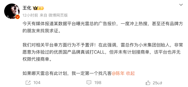 对此,小米集团公关部总经理王化在社交媒体发文称,“我们对相关平台单方面行为不予置评!在此强调,雷总作为小米集团创始人,非常愿意为体验过的优质国产品牌真诚打CALL,但并未有计划接商单,该平台也并无权限代接商单。”