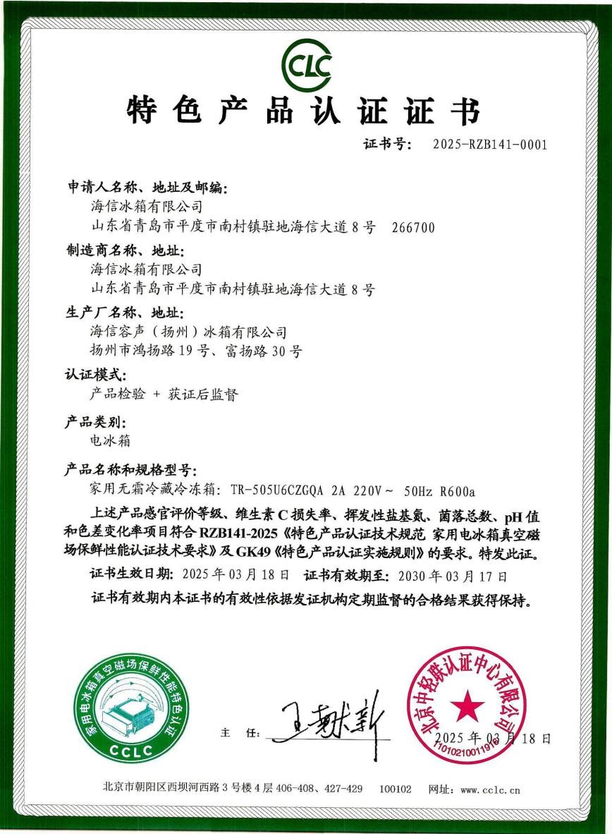 凭借在真空磁场保鲜技术上的突出表现,日前,海信璀璨U6系列冰箱获得由中国家用电器研究院、北京中轻联认证中心颁发的“家用电冰箱真空磁场保鲜性能特色产品认证”证书,这标志着海信冰箱在保鲜技术领域再次取得突破性进展。