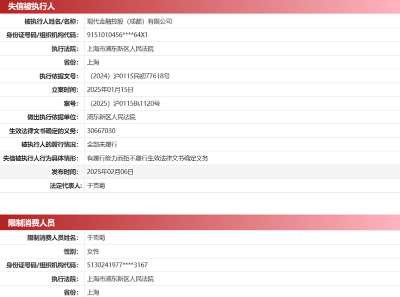 现代金控成立于2010年9月,目前注册资本为1亿元,法定代表人为于克菊。不过,据中国执行信息公开网显示,目前现代金控有一笔逾3066万元款项尚未偿还,同时于克菊被限制消费。