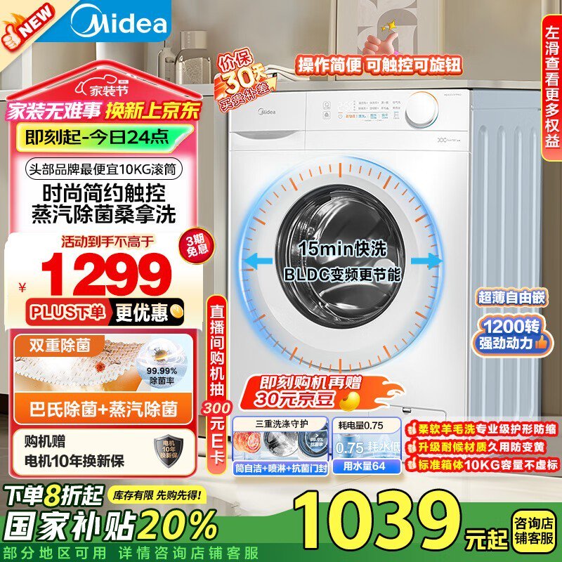美的全自动滚筒洗衣机MG100V11FPRO京东促销到手价845元