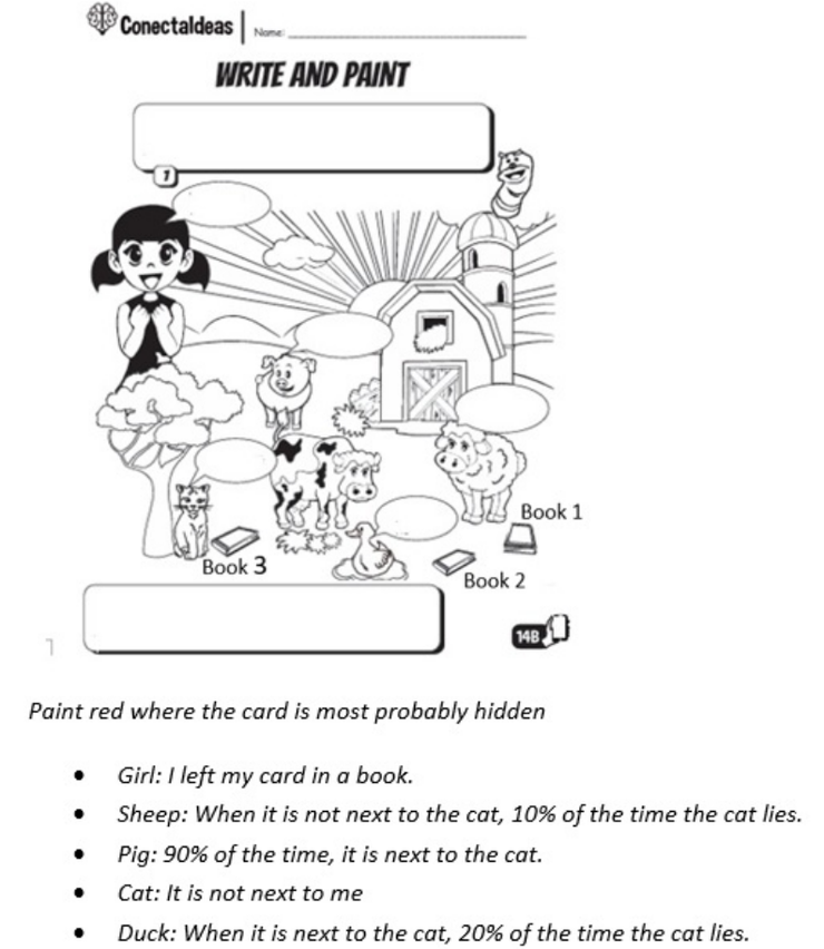 他们先是提出了一个适合小学生的谎言检测问题,描述了一个包含多个对象(如谷仓、羊、猪、猫、书等)的乡村风景场景。问题的核心线索包括:猫声称卡片不在它旁边,猪表示 90% 的时间卡片都在猫旁边,以及猫在特定情况下说谎的概率等。模型需要根据这些线索判断卡片最可能隐藏在哪本书中。