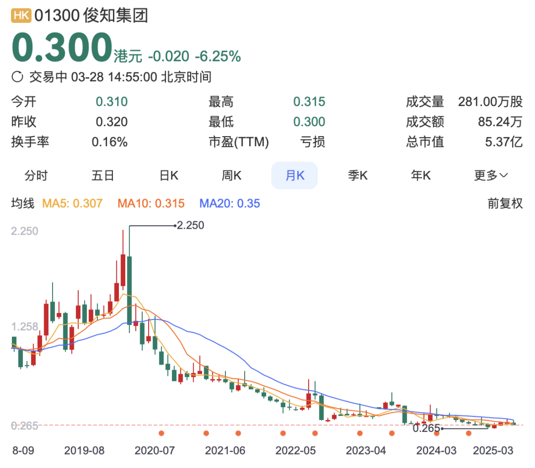 连续三年亏损,使得俊知集团股价持续萎靡。截止发稿,俊知集团报。03港元/股,总市值为5.37亿港元(约合5.02亿人民币)。