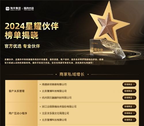 近日,淘天集团-服务市场揭晓了 2024 年度 "星耀伙伴" 榜单,慧博科技凭借「集客CRM」与「集客积分」双旗舰产品,强势荣登 "客户关系管理" 与 "用户互动小程序" 两大核心类目 TOP3(服务市场热销产品排名),成为了众多品牌商家们的优选。