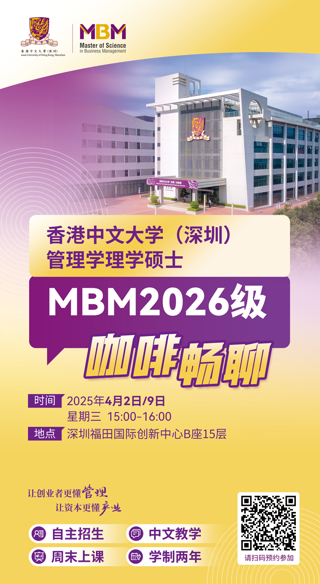 香港中文大学(深圳)管理学理学硕士MBM项目以“让创业者更懂管理,让资本更懂产业”为课程宗旨,致力于培养融合金融智慧、产业洞察力与前沿科技应用能力的复合型人才。随着AI技术的蓬勃发展,MBM项目将持续促进学术界与产业界的深度交流与合作,携手推动AI技术在企业管理中的创新应用与持续发展。