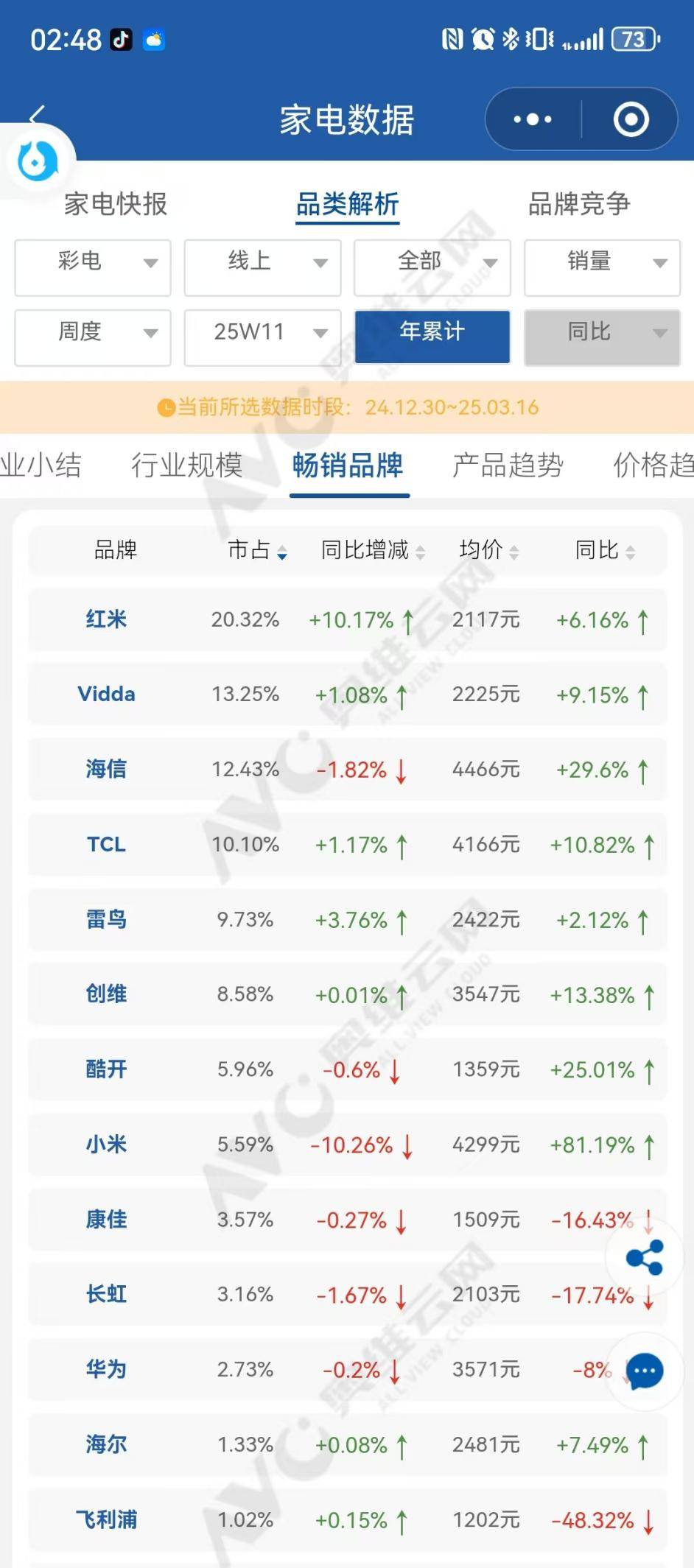 近年来,电视消费市场一直呈现低迷态势,众多国内外传统强势品牌纷纷退出市场,或份额萎缩至底部。而Vidda作为一个新品牌,在短短数年内就取得了快速的市场占有率提升。统计数据显示,2024年Q2-Q4,在5000元以上高端投影市场,Vidda作为入行两年半的新人,一举成为销额第一名。在电视市场,2025年截至目前,Vidda一直保持线上独立品牌销量TOP2的迅猛势头。