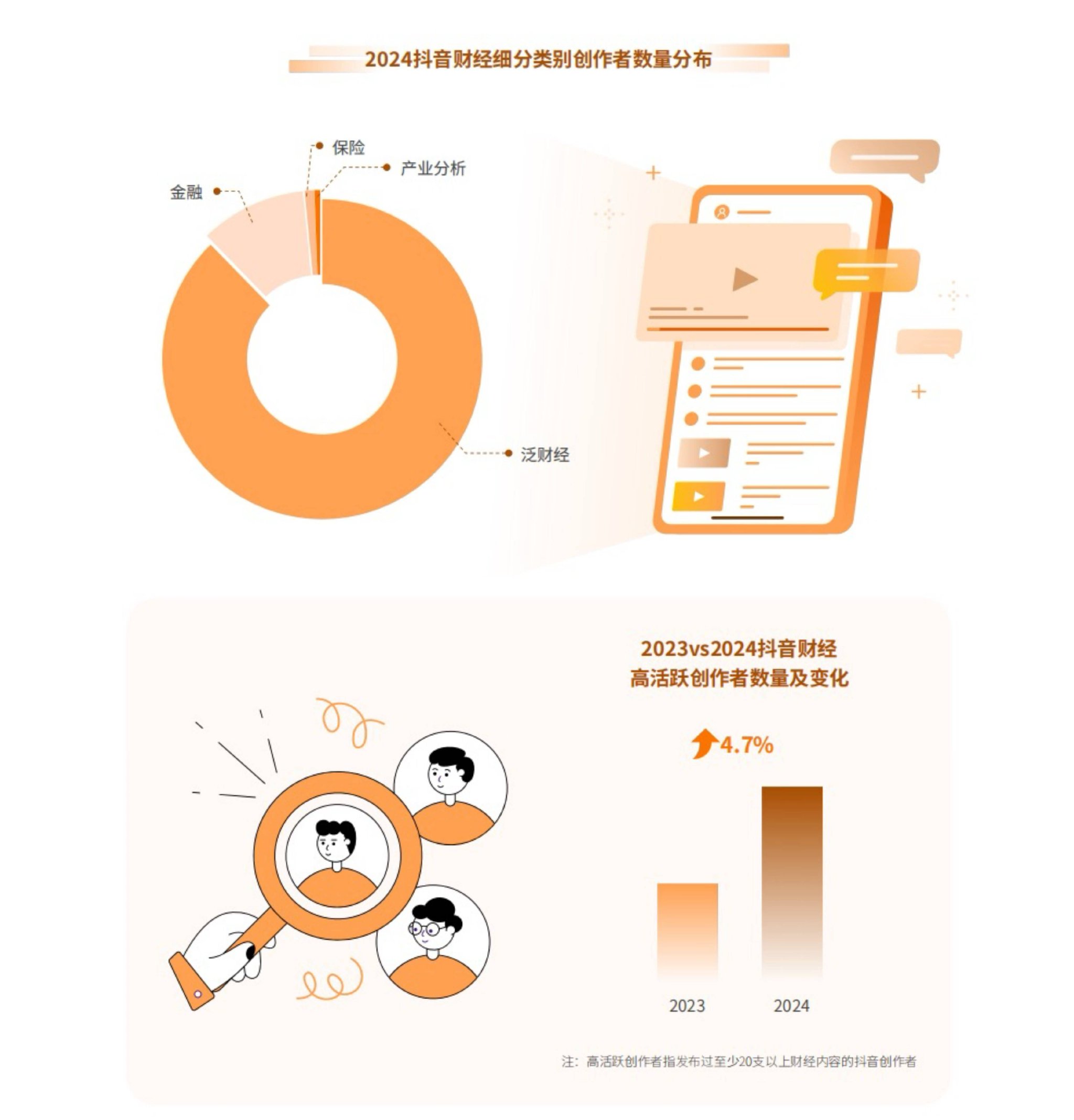 首先,高活跃创作者数量持续增长,推动知识边界不断重塑。从企业家、创业者、行业专家的专业分析,到从业者、爱好者的通俗科普,多元创作者共同丰富财经内容生态。截至2024年12月31日,发布财经视频20支以上的创作者数量同比增长4.7%,越来越多的创作者在抖音响应用户对财商提升的需求,积极投身知识普惠的探索之中。