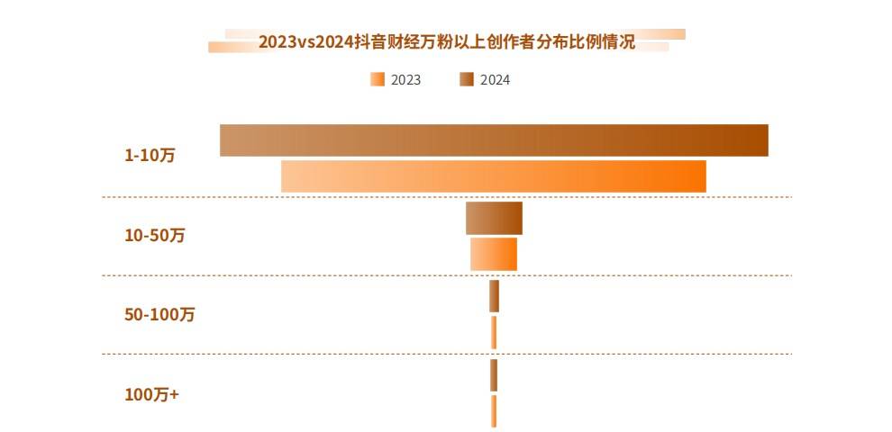 其次,10万粉丝以上的财经创作者规模持续扩大,头部矩阵不断扩充。相较于2023年,2024年10万粉以上财经创作者的占比增长了71%。头部创作者逐步累积的“马太效应”,不仅强化了专业内容的深度,还加速了财经内容生态的迭代升级。
