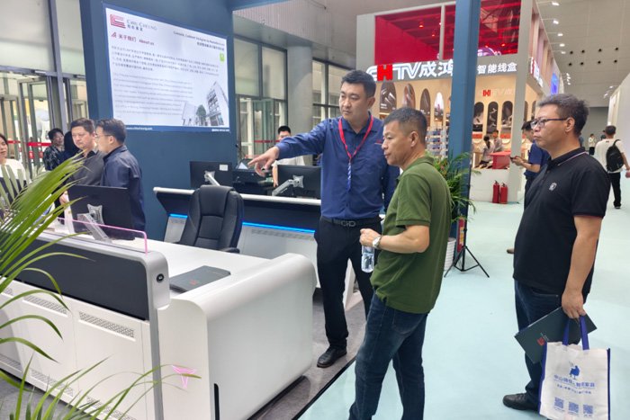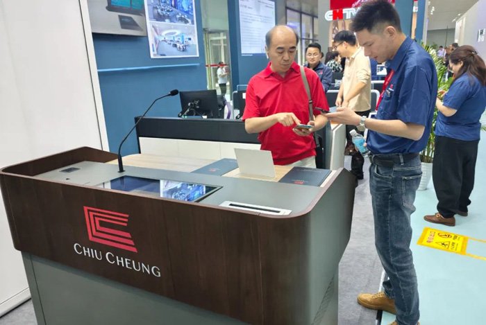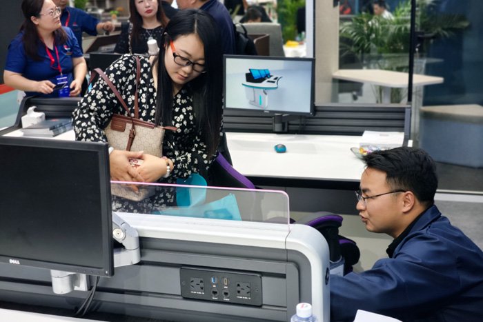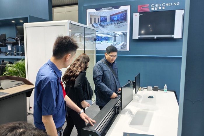 照彰新品‘高教演讲台’也吸引了客户纷纷驻足体验。这款高教演讲台是照彰专为高等教育环境设计,是演讲者在进行课堂教学、学术报告、专题讲座等汇报时所使用的专业讲台。