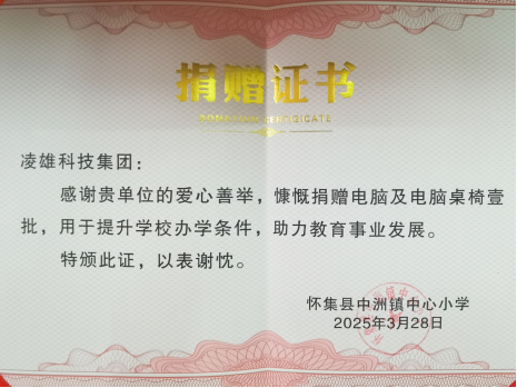 中洲镇中心小学向凌雄科技颁发的捐赠赠书