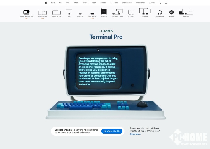 苹果在官网的Mac销售页面上推出了一款名为“Lumon Terminal Pro”的电脑产品,这款电脑正是在Apple TV+上热播的剧集《人生切割术》(Severance)中出现的虚构设备。