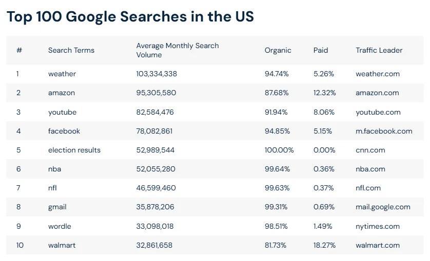 电子商务巨头亚马逊在美国每月平均被搜索9530万次,占据了美国搜索市场的3.2%份额,其品牌关键词。这巩固了其作为电子商务无可争议的领导者的地位,占据了美国搜索市场的3.2%份额。其他值得注意的购物相关搜索包括: