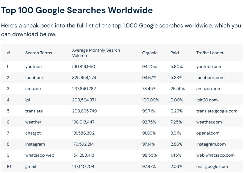关键字YouTube占据搜索热度榜首,平均每月搜索量高达5.108亿次。此外,用户经常使用简写关键字yt搜索YouTube,平均每月搜索量达5440万次,网站访问量总计达28亿次。