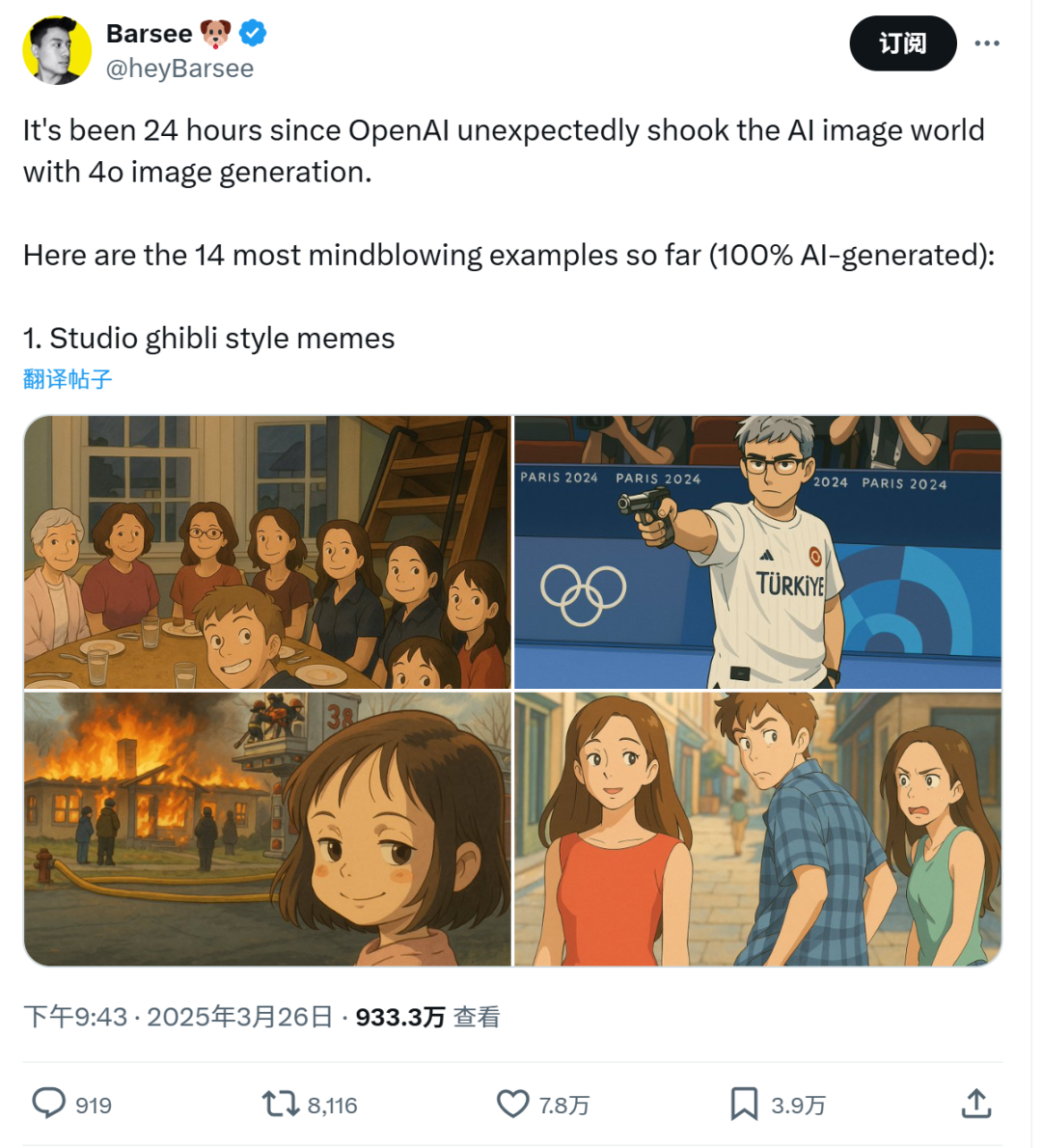 一天之后,大量利用GPT-4o生成的吉卜力风格图片风靡网络,掀起了一场病毒式的传播热潮,也让这一功能更加广为人知。