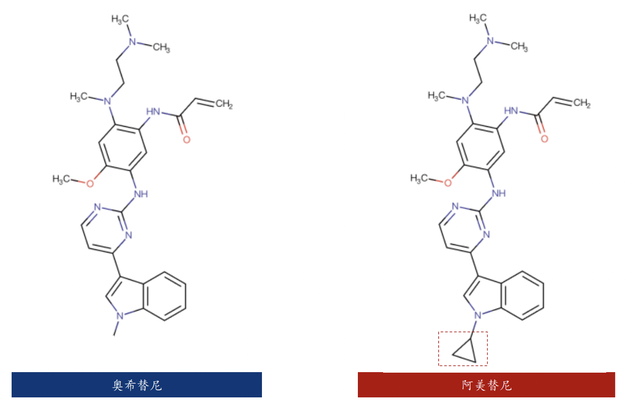 咱们就以目前为翰森贡献营收最多的阿美替尼举例(2024年翰森阿美替尼的营收应该在40亿左右),仔细看下图,阿美相比原研奥希,其实就是左下角吲哚环上氮原子连接的基团有了一些变化,将前者的甲基换成了环丙烷。