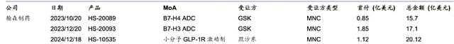 所以,翰森后面的在研管线明显FIC、BIC就多了,而且这两年接连达成三笔较大的对外授权,授权方还都是知名跨国大药企GSK、默沙东。先是两款ADC药品,首付款分别为0.85以及1.85亿美元,今后可能分别获最多 14.85 亿、15.25 亿美元里程碑付款(共约 210多亿人民币)与产品上市后的特许使用费;然后又是一款小分子GLP-1口服药,首付款1.12亿美元,后续最多里程碑付款19亿美元(约130多亿人民币)。