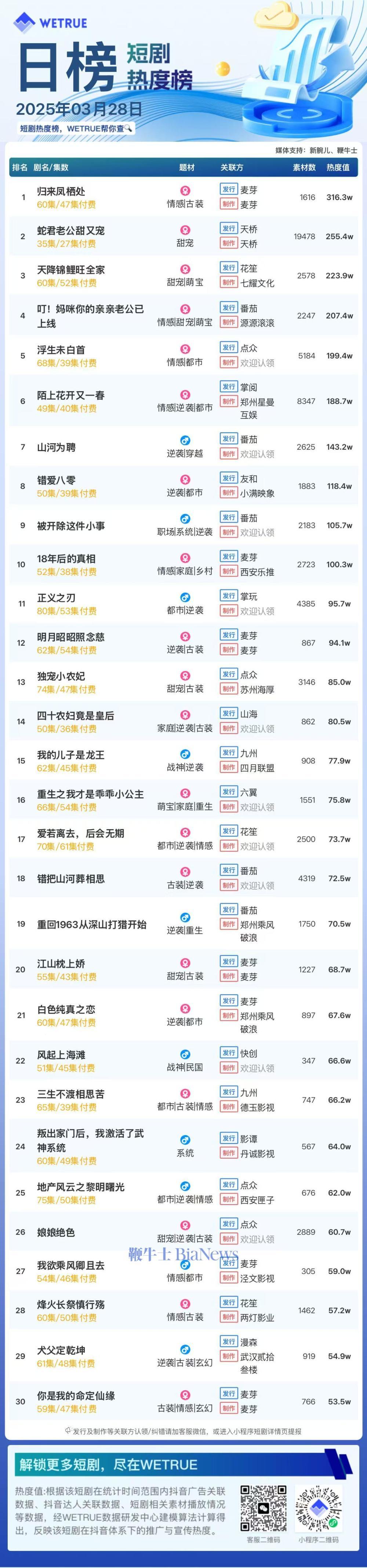 28日短剧热度榜:《归来凤栖处》连续五天第一,大盘热度5949万