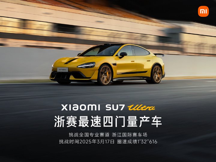 从性能上来看, 小米 SU7 Ultra 是「地标最快四门量产车」,28 号刚刚把在浙赛的圈速干到了 1 分 32 秒 616。这个成绩靠的是在三电系统、刹车、散热上的极致堆料。
