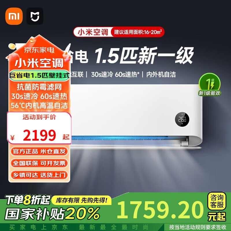 小米新1级能效空调1匹巨省电低至1759元