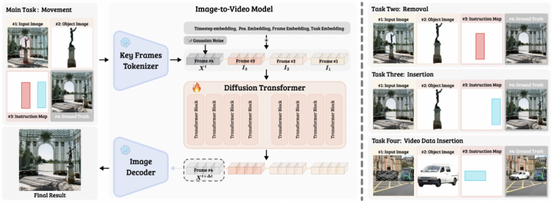 具体而言,本文通过将输入图像、待移动物体、用户指令与目标位置统一编码为视频序列形式,以不改变模型原架构的前提下直接进行微调,充分利用了视频模型预训练时习得的物理规律及物体对应关系(Object Correspondence),从而在图像编辑任务中实现了精确的光影同步与身份特征保持。