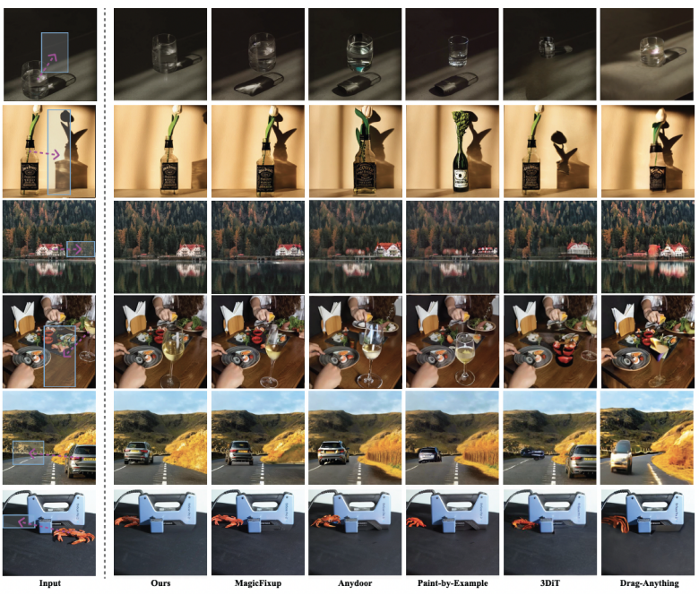 近年来,图像生成与编辑技术的快速发展,特别是扩散模型(Diffusion Models)的兴起,使得图像编辑任务取得了显著进展。然而,现有技术在实现图像中物体的移动、插入和移除时,仍存在诸多问题:比如物体在新位置的光照与阴影无法与环境真实协调,物体身份特征发生失真,以及物体移动产生的空缺区域无法自然地补全。这些问题在复杂的真实场景中尤为突出。