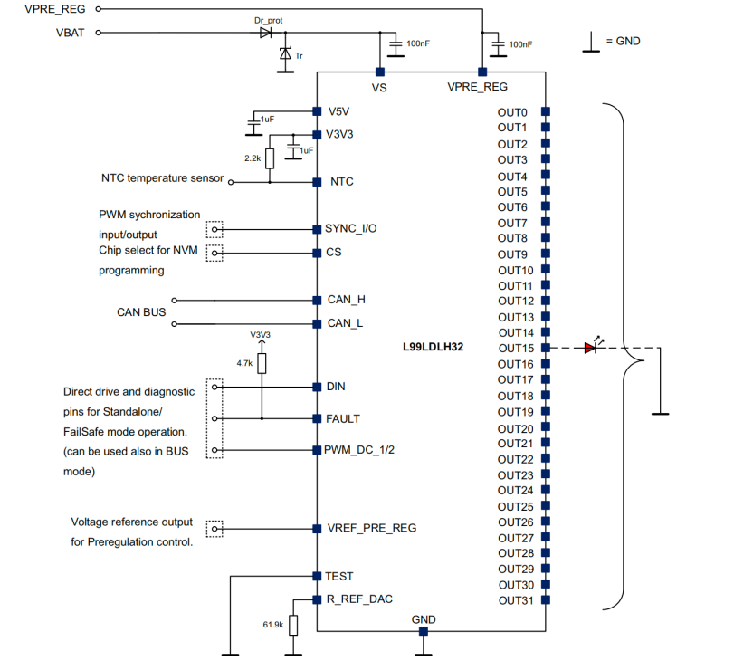 但OLED的驱动控制远比传统光源复杂。每个像素点需要独立控制亮度与开关时序,同时还要满足车规级可靠性要求。这就催生了高度集成的驱动芯片需求——既要支持多通道独立控制,又要集成通信协议、温度管理、故障诊断等核心功能。正是在这种背景下,意法半导体的L99LDLH32这类32通道LED驱动器应运而生,其核心价值在于通过单芯片解决方案破解复杂照明系统的设计难题。