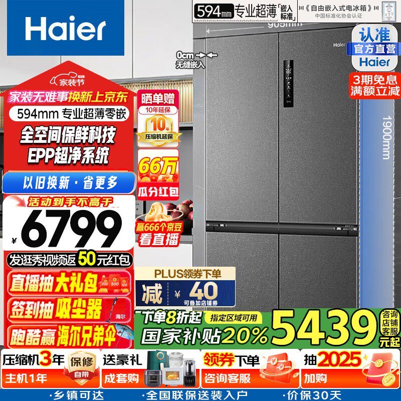 海尔518L风冷十字对开门冰箱嵌入式设计促销