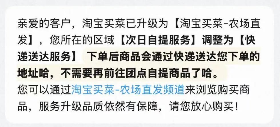 3 月 29 日消息,淘宝买菜日前向用户发送通知称,淘宝买菜已升级为【淘宝买菜-农场直发】,【次日自提服务】调整为【快递送达服务】,下单后商品会通过快递送达下单的地址。