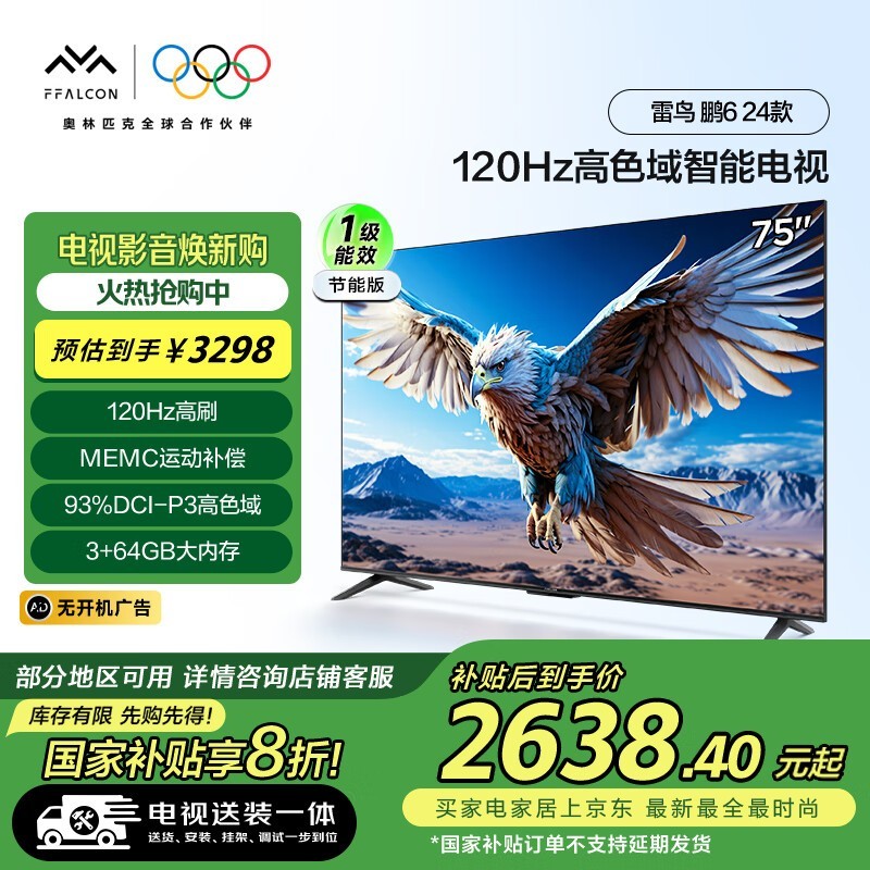 雷鸟鹏6 75英寸电视京东优惠价2220元