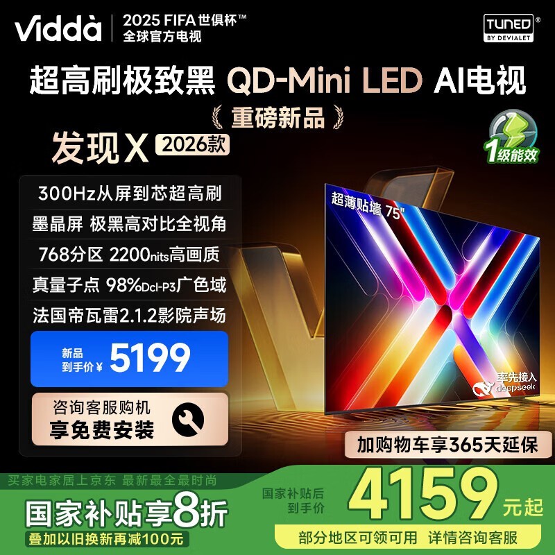 Vidda发现X2026款75英寸QD-MiniLED电视京东特惠4062元