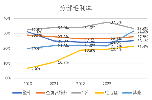 敏实在24年首次突破副车架、电控壳、电机壳业务和日本丰田的结构件订单,这些都体现在公司其它产品分类的数据,拉动其它产品收入增长22.2%,毛利率同比增长9.9pct到31.6%。