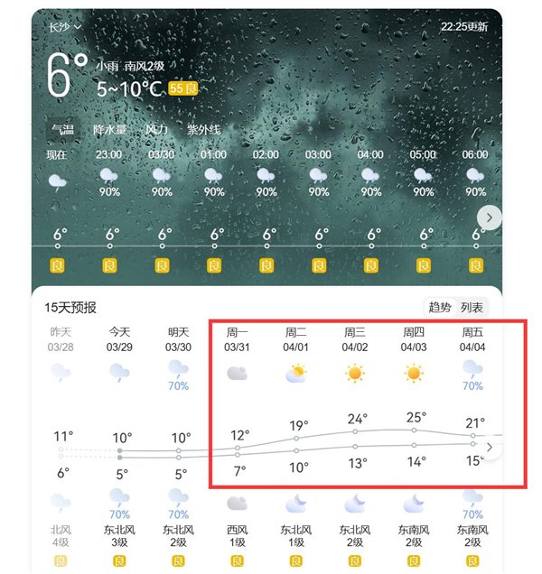 展望下周,气温将在波动中逐渐回升,到清明节前后,华北平原多地最高气温接近或超过25°C,南方大部气温也将重返20℃,部分地区超25℃,像长沙今天气温不足10℃,到4月3日最高气温可达25℃左右,累计升温幅度接近20°C。
