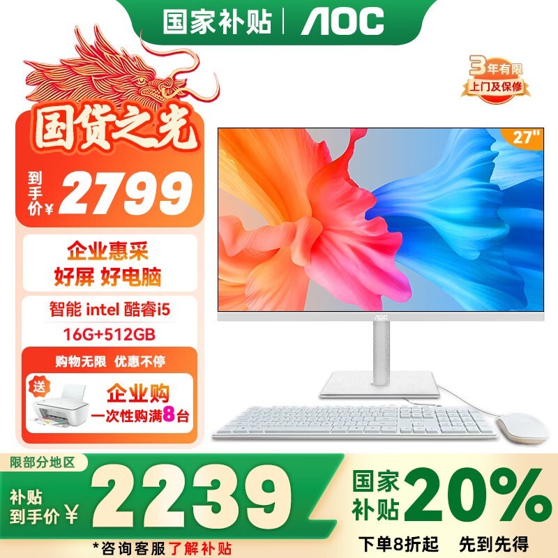AOC刀锋1代27英寸一体机i5-1035G1/16GB/512GB京东特惠2699元