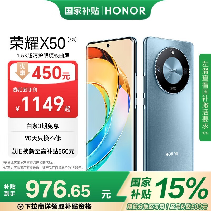 荣耀X50 5G手机勃朗蓝 8GB+256GB 大存储京东到手仅1149元