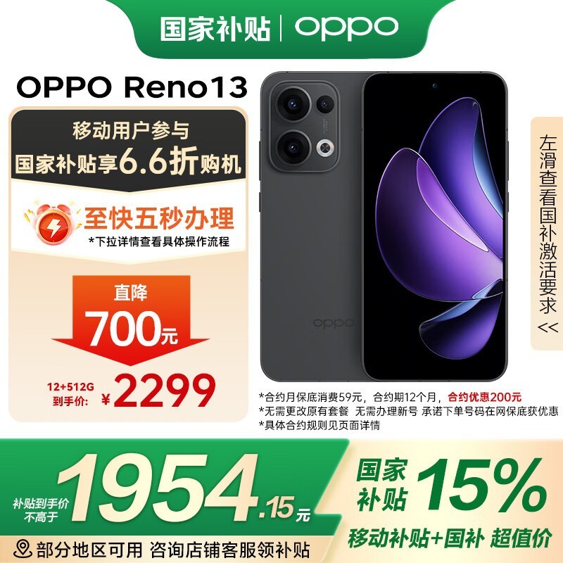 OPPO Reno13 5G手机12GB+512GB午夜黑京东优惠仅1954元
