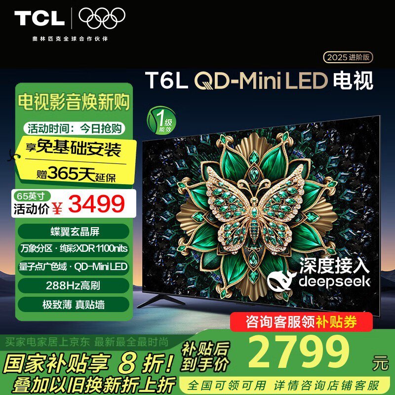 TCL 65T6L 65英寸4K电视促销,到手价2799元