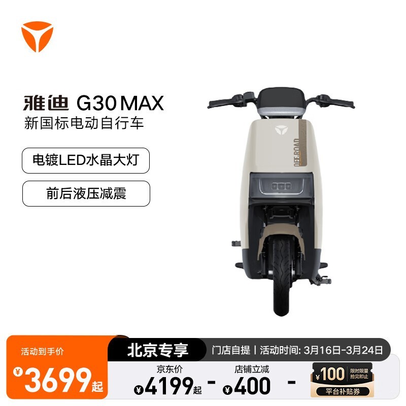 雅迪电动车G30MAX京东优惠中满2000减400到手3799元